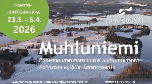 Äänekosken kaupungilla on jatkuvasti tarjolla 150 omakotitonttia ja vapaana on myös upeita rantatontteja. UUTTA! Muhluniemen uusi omakotitaloalue Postimestarintie avautuu ensi kertaa tonttihuutokauppaan Jyväskylän Rakennusmessuilla 20.3. - 22.3.2026.
