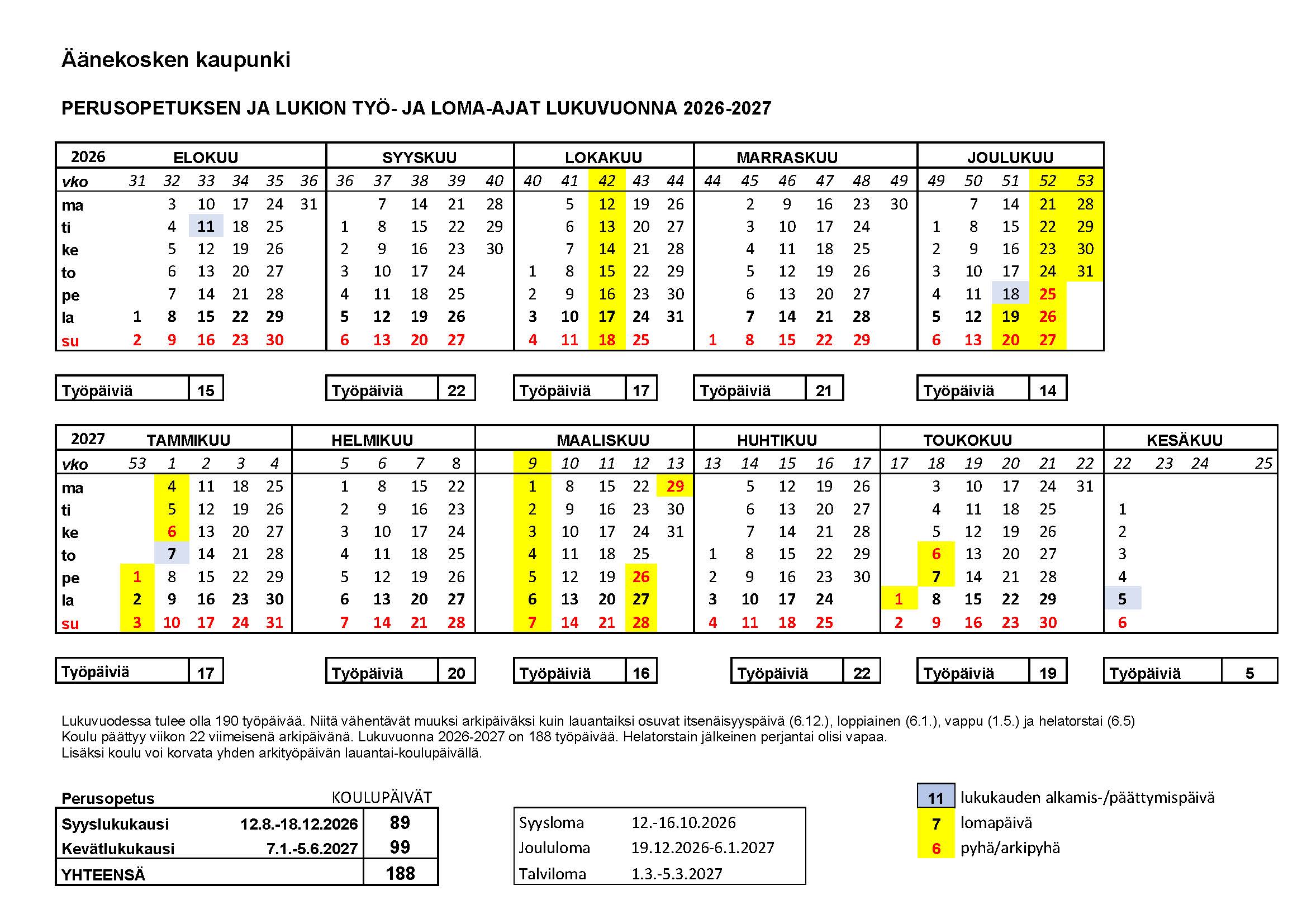 Lukuvuodessa tulee olla 190 työpäivää. Näitä vähentävät muuksi arkipäiväksi kuin lauantaiksi osuvat itsenäisyyspäivä ( 6.12), loppiainen (6.1), vappu (1.5), ja helatorstai. Koulu päättyy viikon 22 viimeisenä arkipäivänä. Lukuvuonna 2026-2027 on 188 työpäivää. Helatorstain jälkeinen perjantaisi olisi vapaa.