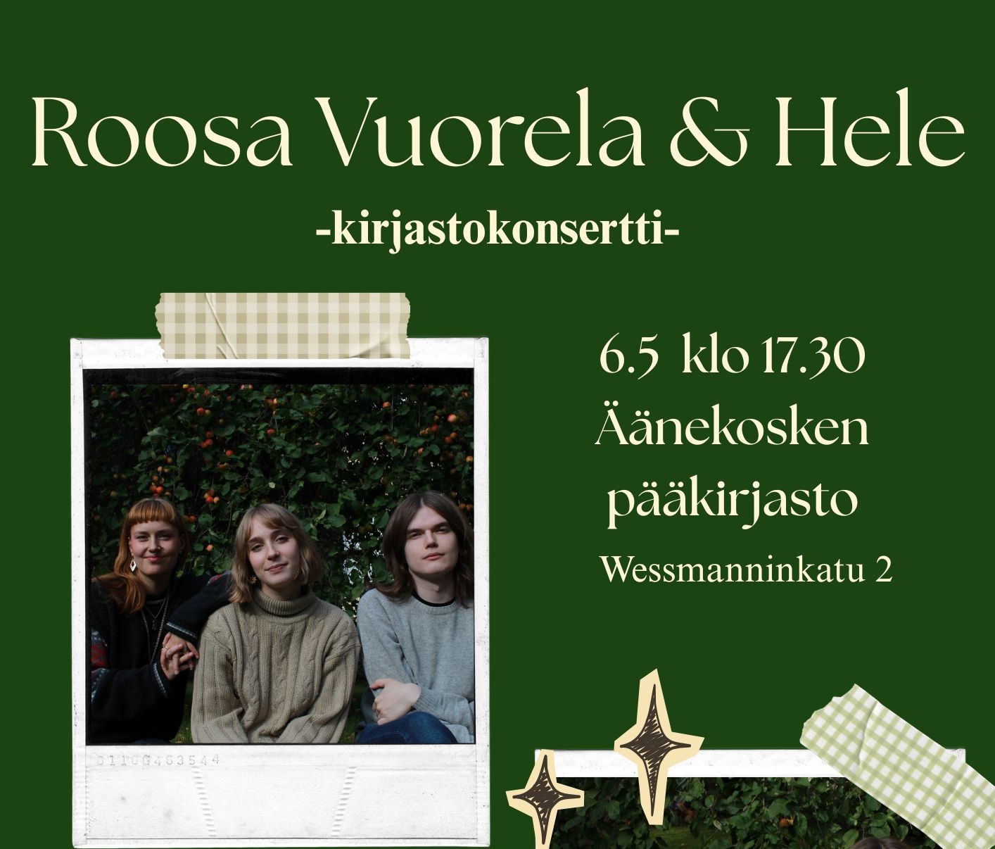 Kirjastokonsertti Roosa Vuorela & Heleke 6.5. klo 17.30 |
