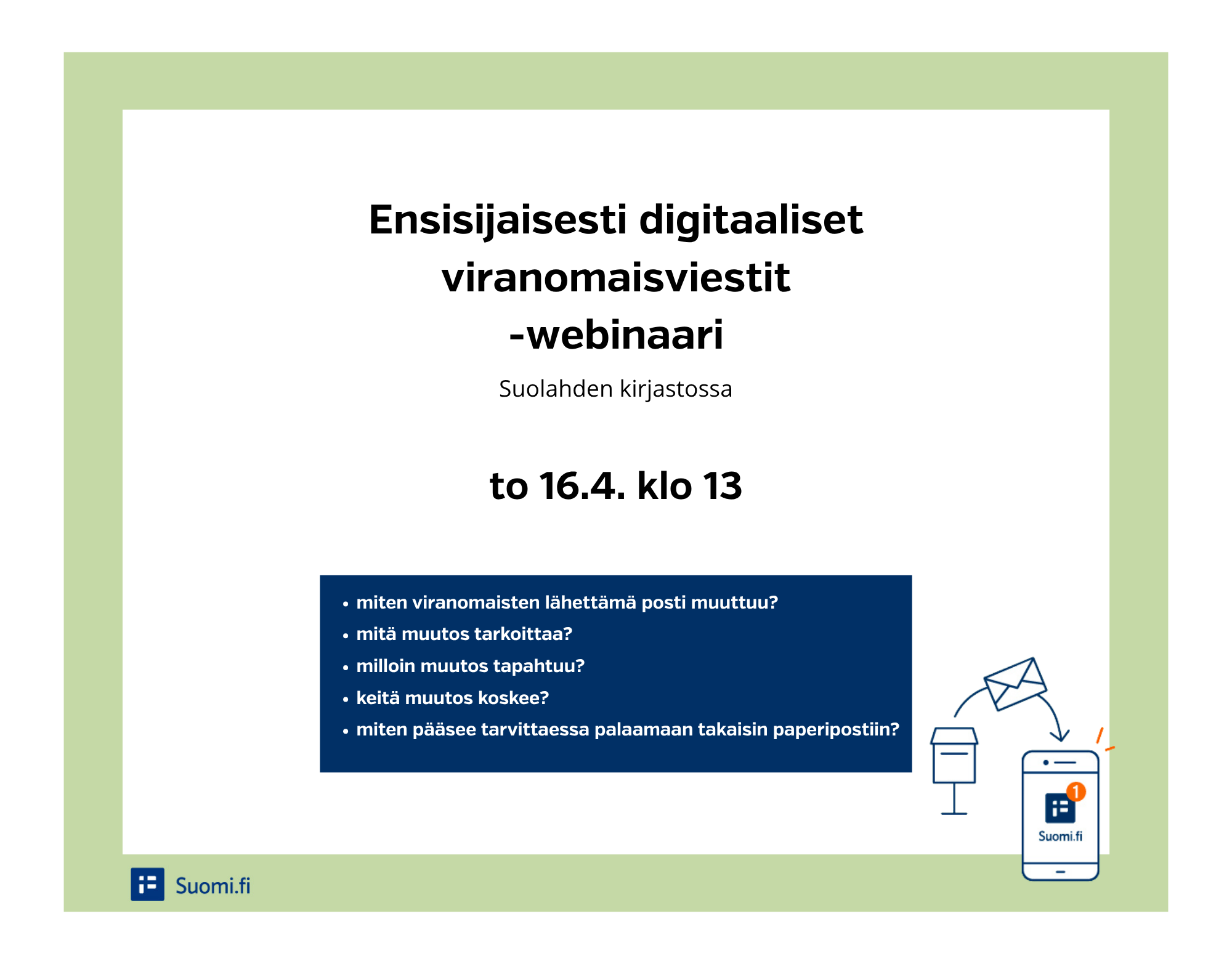 Ensisijaisesti digitaaliset viranomaisviestit -webinaariSuolahden kirjasto to 16.4. klo 13 |