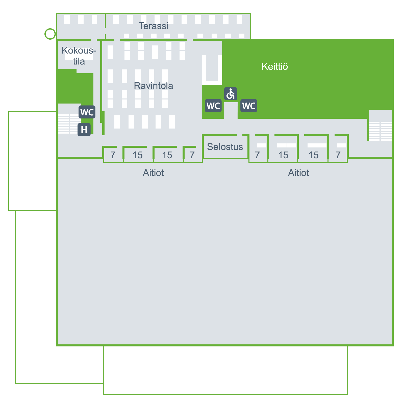Neljässä aitiossa on keittiö, jonka varustukseen kuuluu mikro, jääkaappi, pesuallas, säilytystilaa sekä pöytäryhmä. Keittiöosuudesta on suora käynti aitiopaikoille. Keittiö ja aitio ovat erotettavissa liukuovella. Aitiopaikkoja vuokrataan peleihin, tapahtumiin ja konsertteihin.