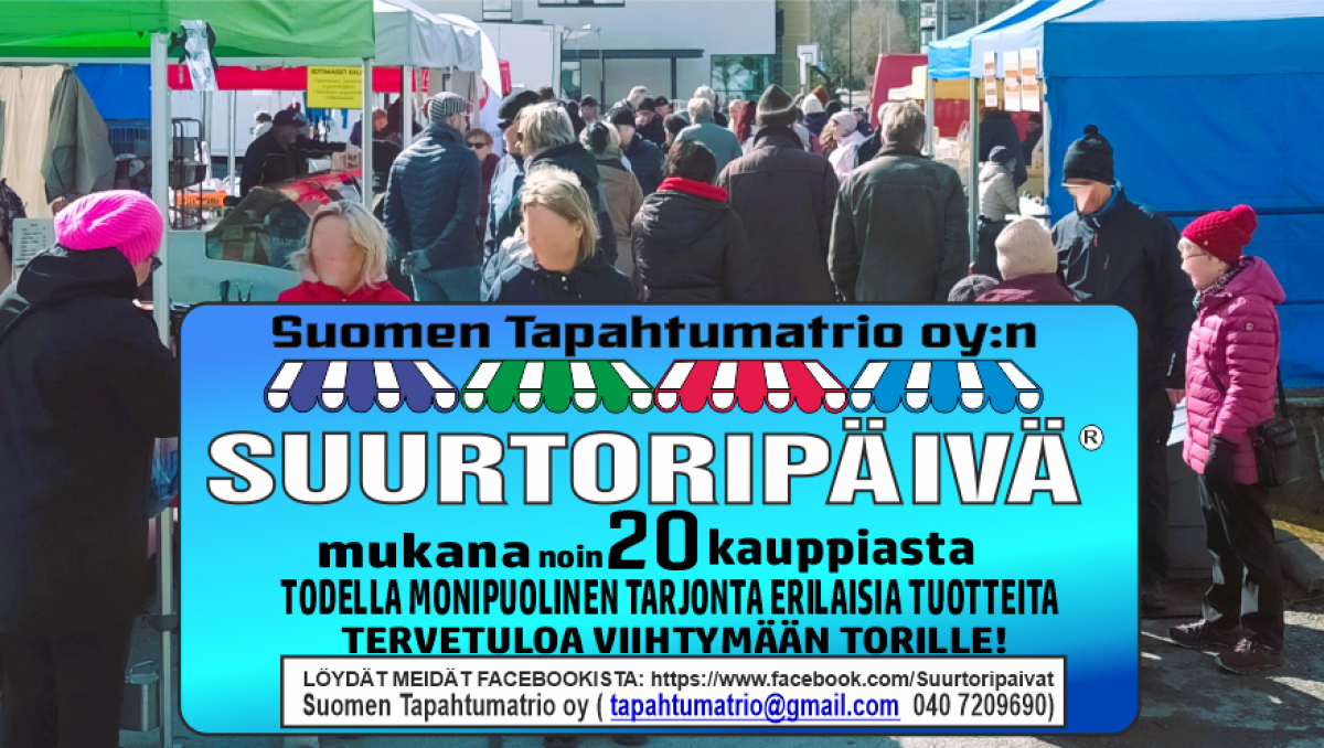 Suomen Tapahtumatrio oy:n Suurtoripäivä on isompi toripäivä kuin useimmilla paikkakunnilla toripäivät normaalisti, mutta pienemmät kuin markkinat. Siksipä me ollaankin koottu tämä meidän oma kauppiasporukka erilaisten tuotteiden myyjistä, että saadaan tarjottua teille mahdollisimman laaja ja monipuolinen kattaus.