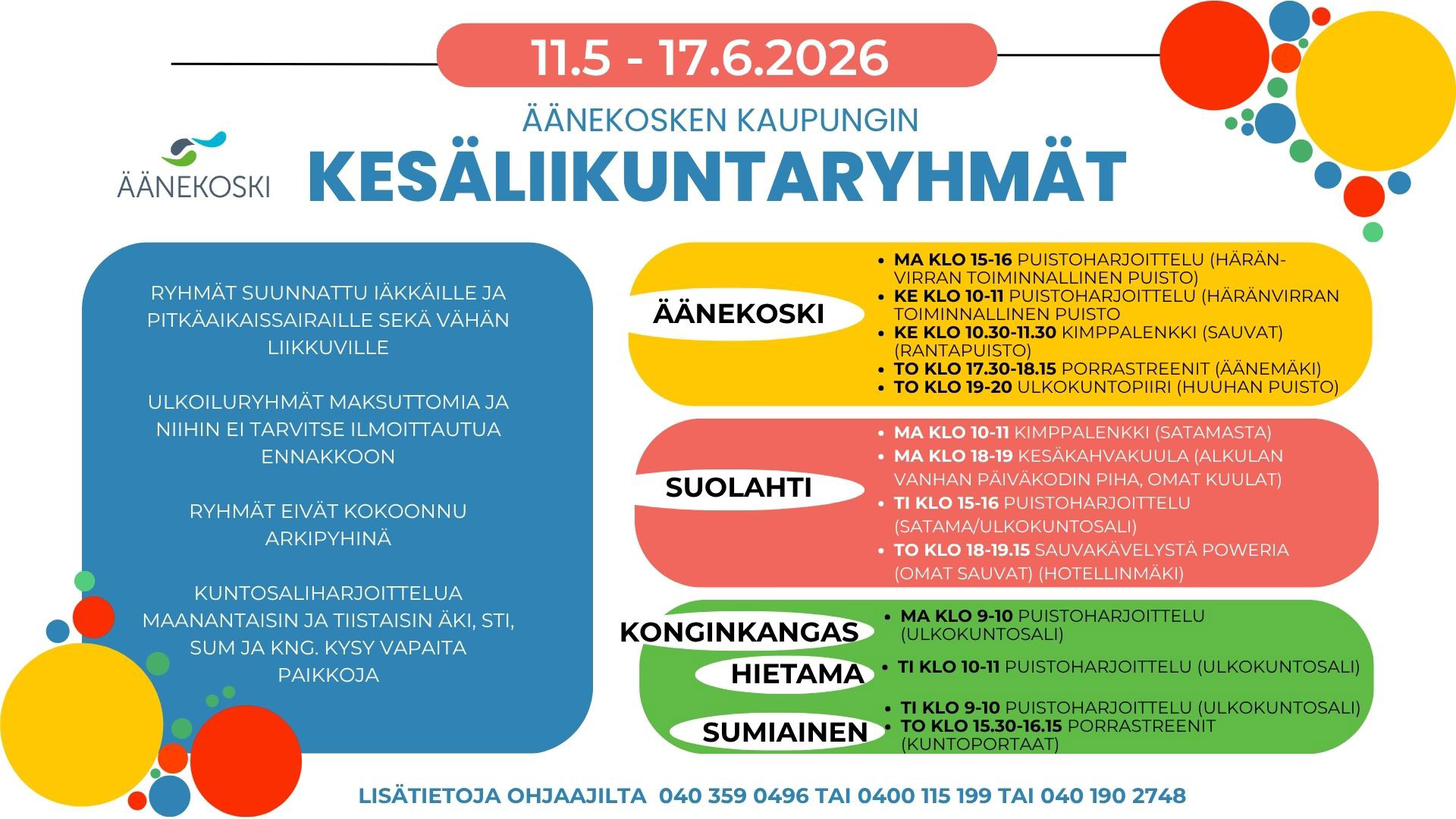 Äänekosken kaupungin liikuntapalvelut tarjoaa kuntalaisille kesäliikuntaryhmiä viidessä eri taajamassa ajalla 11.5. - 17.6.2026. Ryhmät ovat suunnatut iäkkäille, pitkäaikaissairaille ja vähän liikkuville. Voit tulla jatkamaan hyvin alkanutta liikunnallista elämää tai hakemaan vaikka juuri sen aloitukseen tarvittavan startin.