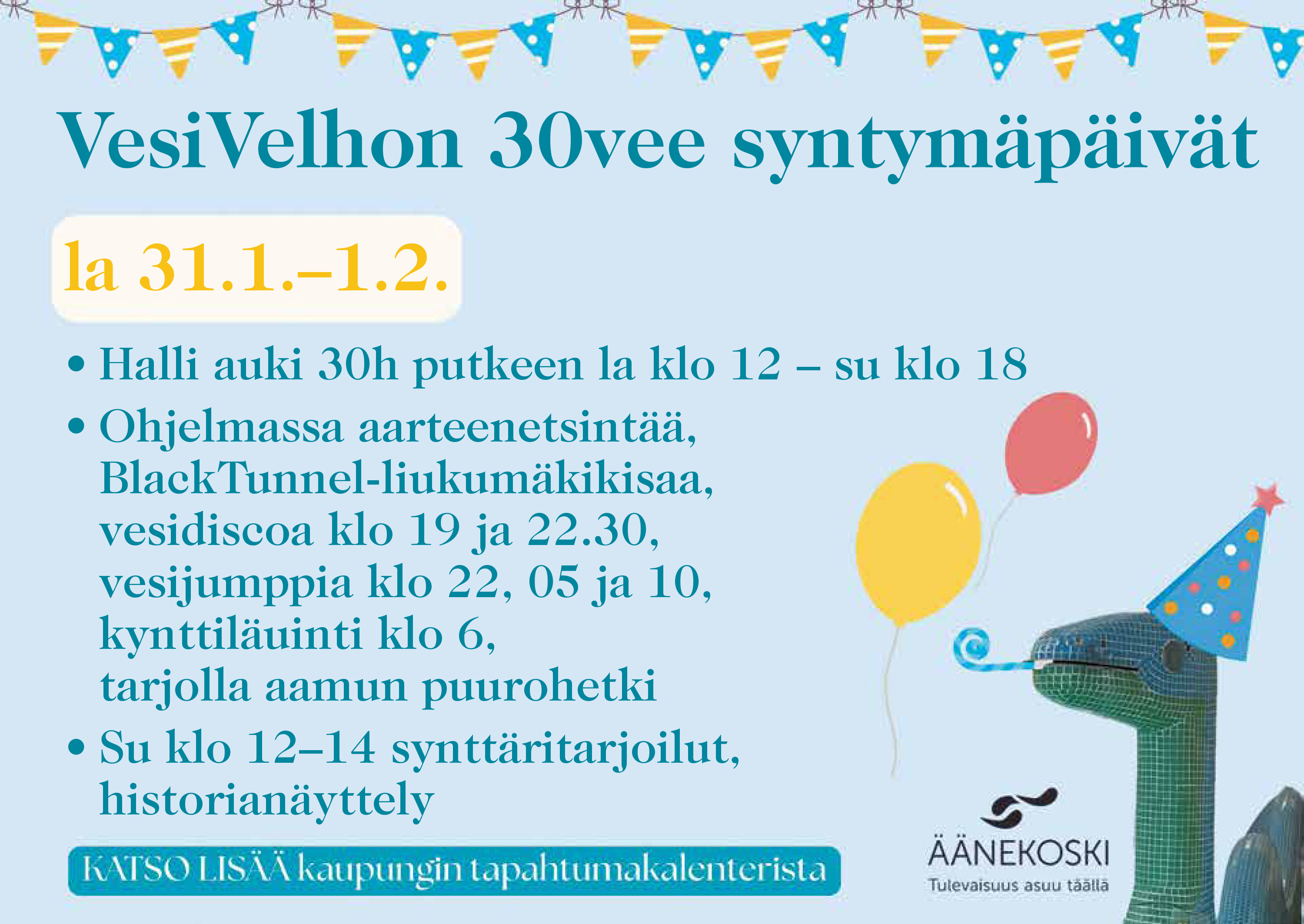 Uimahalli on auki lauantaista 31.1. klo 12 sunnuntaihin 1.2. klo 18 yhteen putkeen! Ohjelmassa aarteenetsintää, Black Tunnel -vesiliukumäkeä, lasten ja yleinen vesidiscoilu, yöllisiä vesijumppia, aamuöistä kynttiläuintia ja aamuinen puurohetki. Huipennuksena su klo 12-14 synttäritarjoilu ja historianäyttely.
