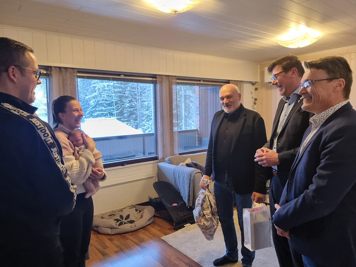 Vuoden ensimmäinen vauva on kaupungin kummilapsi ja häntä muistetaan perinteisesti kummilusikalla ja muilla lahjoilla. Kaupunginjohtaja Matti Tuononen, kaupunginhallituksen puheenjohtaja Kari Kiiskinen ja valtuuston puheenjohtaja Tommi Lunttila kävivät tänään 15.1.2026 tervehtimässä Jämsenin perhettä. Äänekosken vuoden ensimmäinen vauva syntyi 1.1. Noora ja Otto Jämsenin perheeseen ja 2-vuotias Senni on nyt isosisko. Lämpimät onnittelut koko perheelle!